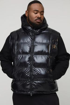 Plus Regular Fit High Shine Quilted Hooded Puffer Gilet - Black - 2Xl, Black