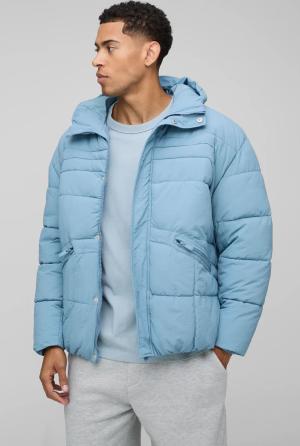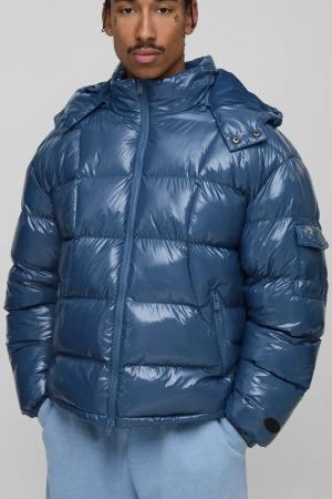 Regular Fit High Shine Quilted Hooded Puffer Jacket - Slate Blue - L, Slate Blue