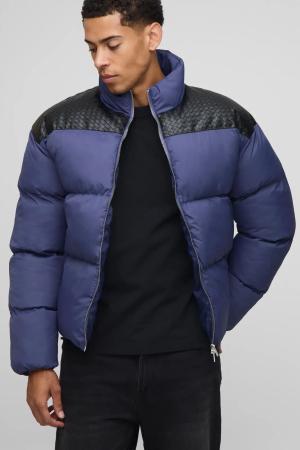 Regular Fit Pu Yoke Nylon Panel Puffer Jacket - Navy - L, Navy
