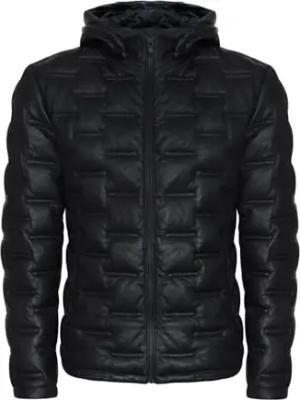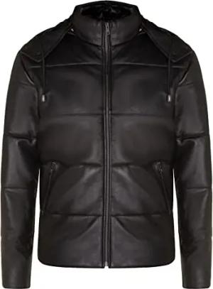 Herren-Pufferjacke Schwarz Abreiben Steppjacke aus Leder mit Kapuze S