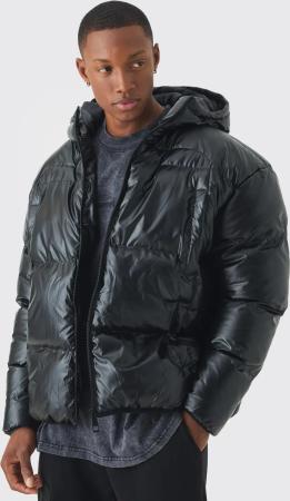 Tall Oversized Boxy High Shine Quilted Hooded Funnel Puffer Jacket - Black - M, Black
