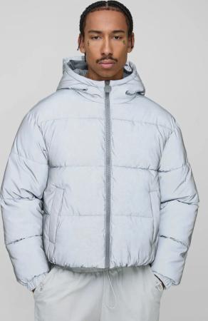 Oversized Boxy Crinkle Reflective Fabric Hooded Puffer Jacket - Grey - L, Grey