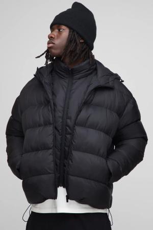 Oversized Boxy Faux Double Layer Hooded Puffer Jacket - Black - M, Black