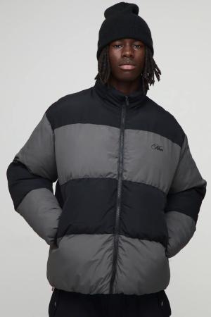 Oversized Colour Block Panelled Puffer Jacket - Black - L, Black