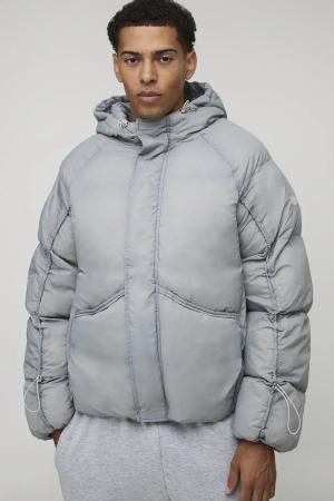 Oversized Fit Ruched Sleeve Panelled Puffer Jacket - Grey - L, Grey