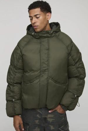 Oversized Fit Ruched Sleeve Panelled Puffer Jacket - Khaki - L, Khaki