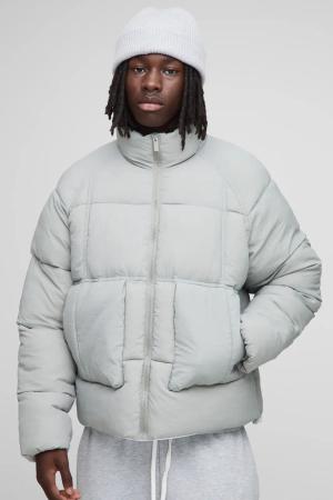 Tall Oversized Fit Washed Nylon Padded Funnel Neck Puffer Jacket - Grey - M, Grey