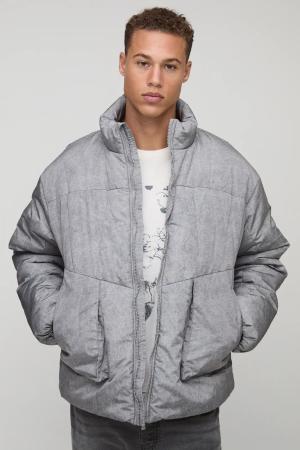 Oversized Boxy Fit Washed Nylon Padded Funnel Neck Puffer Jacket - Grey - L, Grey