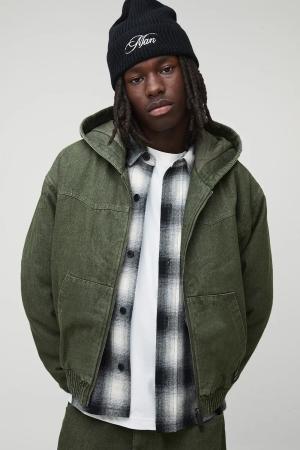 Kastiger gesteppter Denim-Hoodie mit Reißverschluss - Grün - XL, Grün