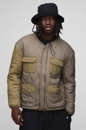 Kragenlose gesteppte Colorblock Ripstop Jacke - Grün - L, Grün