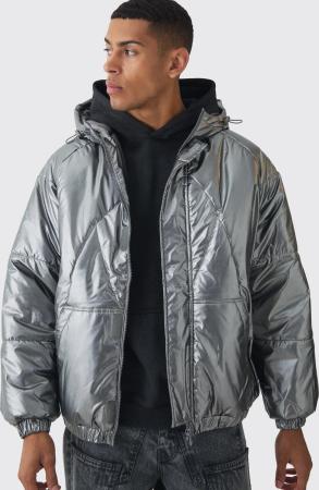 Oversize Metallic Steppjacke mit Kapuze - Grau - XS, Grau