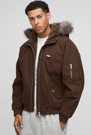 Oversized Boxy Zip Detail Faux Fur Hooded Twill Bomber Jacket - Braun - S, Braun