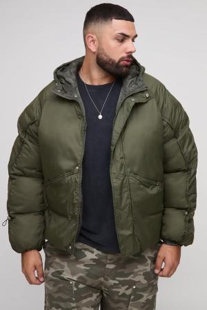 Plus Oversized Fit Ruched Sleeve Panelled Puffer Jacket - Khaki - 3XL, Khaki