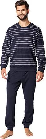 Herren Schlafanzug Zweiteiler Langarm Pyjama lang bunt aus Baumwolle LA40-220 (Marineblau Weiß, L)