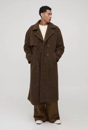 Oversized Fit Double Breasted Longline Boucle Overcoat - Chocolate - L, Chocolate