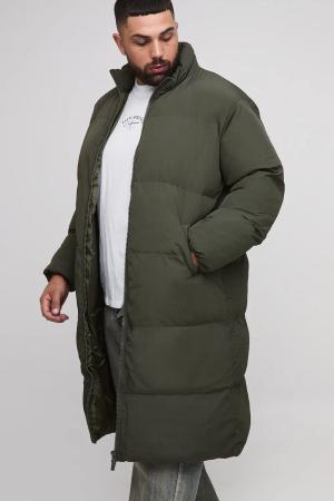 Plus Oversized Crinkle Nylon Funnel Neck Longline Puffer Jacket - Dark Olive - 2Xl, Dark Olive