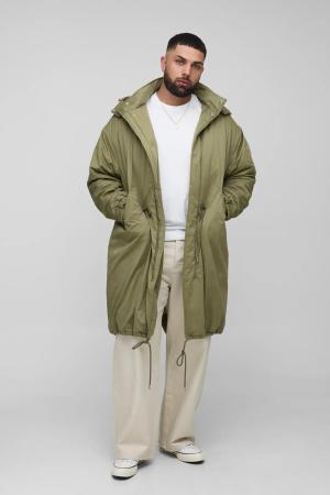 Plus Regular Fit Peached Nylon Funnel Neck Mid Length Parka Jacket - Khaki - 3Xl, Khaki