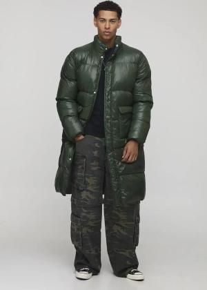 Regular Fit High Shine Longline Puffer Jacket - Khaki - L, Khaki