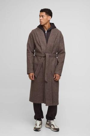 Single Breasted Shawl Collar Self Belted Longline Marl Melton Overcoat - Chocolate - L, Chocolate