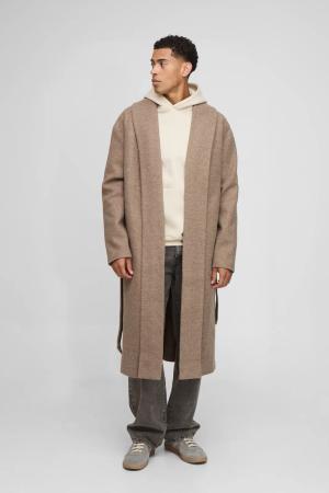 Single Breasted Shawl Collar Self Belted Longline Marl Melton Overcoat - Stone - L, Stone