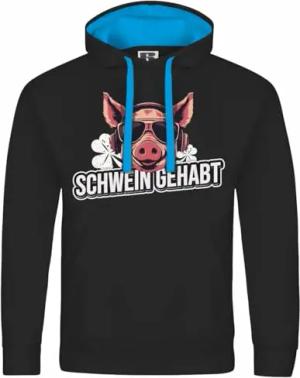 Herren Kapuzenpullover mit Aufdruck Schwein gehabt -, Größe:S, Farbe:schwarz/Blaue Kapuze