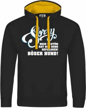 Herren Kapuzenpullover mit Aufdruck Sorry Mein Kostüm hat der Hund gefressen - Humorvoll Statement, Größe:S, Farbe:schwarz/gelbe Kapuze