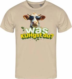 Herren T-Shirt mit Aufdruck was KUHgst du -, Größe:S, Farbe:Sand