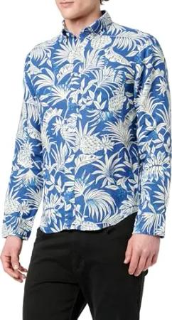 Herren REG Botanical Print Linen Shirt Hemd, Rich Blue, XL