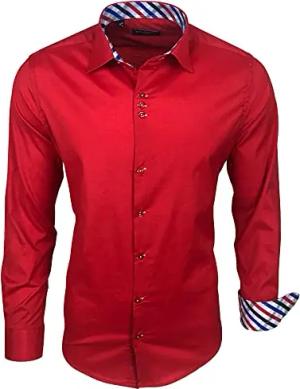 Elastisch Slim Fit Hemd für Freizeit Business Hochzeit - Reine Farbe Kentkragen Langarm Kontrast Herren-Hemd B-508, Farbe:Rot, Größe:L