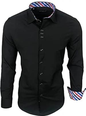 Herren-Hemd Slim-Fit Bügelleicht Für Anzug, Business, Hochzeit, Freizeit - Langarm Hemden für Männer Langarmhemd R-44, Farbe:Schwarz/Sax, Größe:S