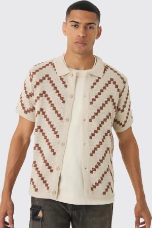Oversized Basket Weave Panelled Shirt - Brown - M, Brown
