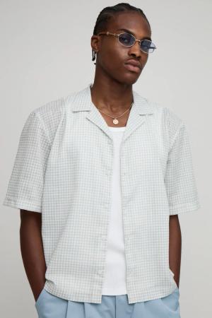 Oversized Short Sleeve Embroidered Micro Check Shirt - Blue - M, Blue