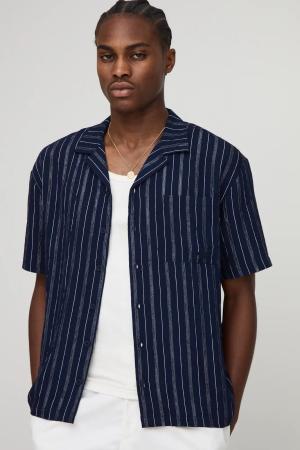 Oversized Revere Embroidered Stripe Short Sleeve Shirt - Navy - M, Navy