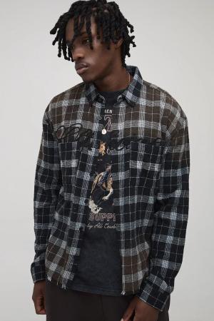 Tall Oversized Boxy Official Distressed Check Check Shirt - Black - L, Black