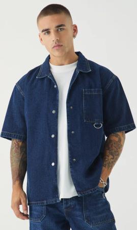 Short Sleeve PU Boxy Cargo Shirt - Blau - S, Blau