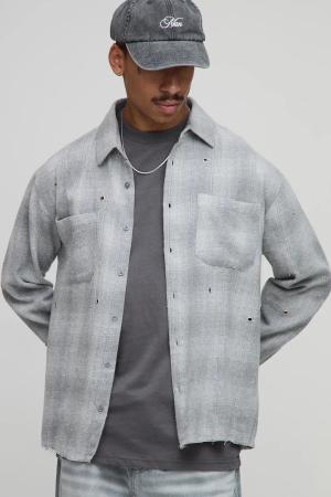 Oversized Distressed Eyelet Detail check Check Shirt - Grau - M, Grau