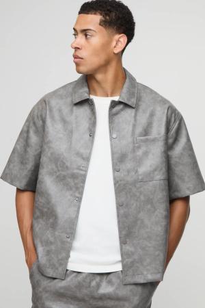 Oversized Short Sleeve Washed PU Collared Overshirt