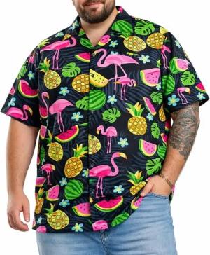 Herren Hawaiihemd Kurzarm, Flamingo Melon, Schwarz, 7XL
