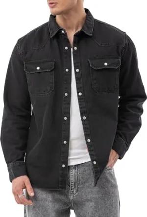 by Spruce – Denim Hemdjacke – Jeanshemd mit Druckknöpfen – Overshirt mit Brusttaschen – Langarm Regular Fit Schwarz S