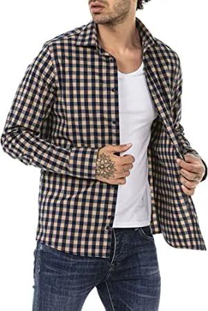 Hemd für Herren Freizeithemd Langarm Baumwolle Kariert Beige S