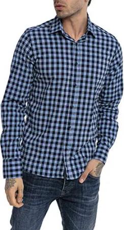 Hemd für Herren Freizeithemd Langarm Baumwolle Kariert Blau M