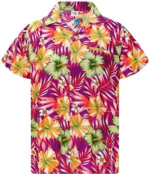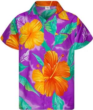 Funky Hawaii-Hemd, Herren, Kurzarm, Tropical-Hibiscus, Violett-Grün, XS