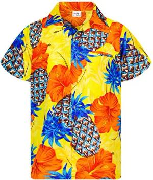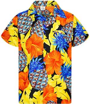 Funky Hawaii-Hemd, Herren, Kurzarm, Pineapple-Hibiscus, Schwarz-Gelb, XXL