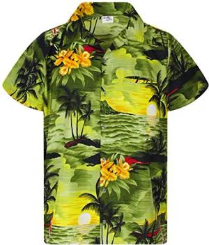 Funky Hawaii-Hemd, Herren, Kurzarm, Cherry-Parrot, Grün, XS