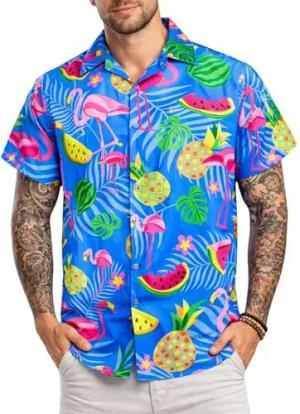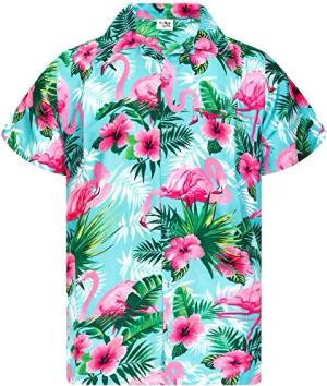 Funky Hawaii-Hemd, Herren, Kurzarm, Flamingo-Flowers, Blau-Türkis, M