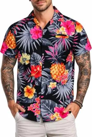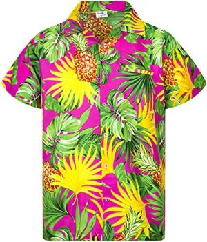 Funky Hawaii-Hemd, Herren, Kurzarm, Pineapple-Hibiscus, Schwarz-Pink, XL