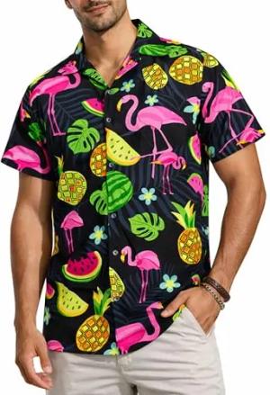 Herren Hawaiihemd Kurzarm, Flamingo Melon, Schwarz, S