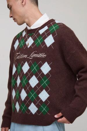 Boxy Embroidered Diamond Argyle Knitted Jumper - Chocolate - L, Chocolate