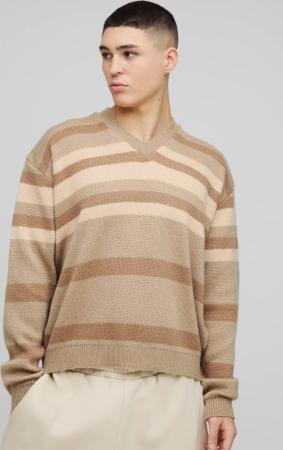 Kastiger Gestreifter Oversize Pullover Mit V-Ausschnitt - Tan - M, Tan