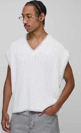 Man Embroidered Oversized V Neck Rib Knitted Jumper Vest - White - M, White